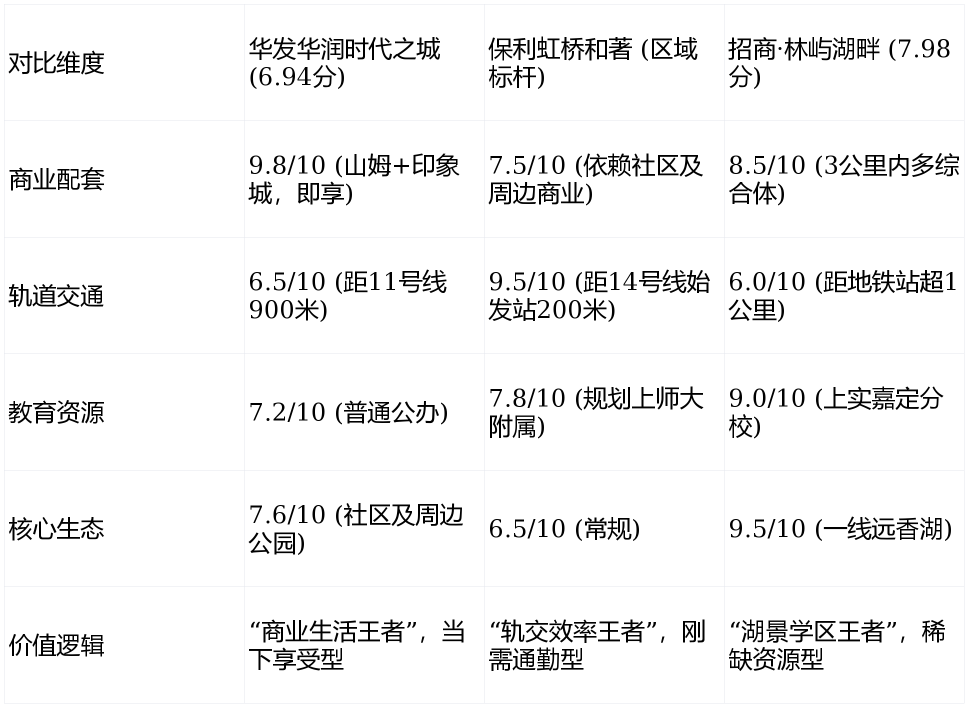 区域价值权重最高,时代之城在此维度得分为 6.94分,在10个项目中处于中游。其价值图谱极为清晰:在“当下生活便利度”上做到了区域顶级,但在“未来通勤效率”和“城市核心资源”上存在明显缺口。