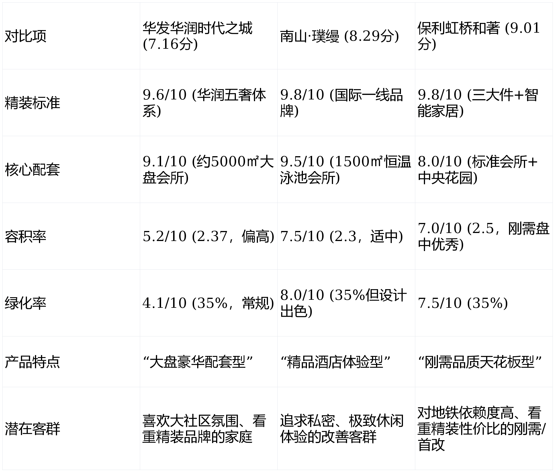 南山·璞缦等项目可能在会所、精装等单点产品力上不逊色,甚至更优。但时代之城凭借 “双央企+30万方大盘” 的组合,在品牌信任度和社区整体气势上形成了压倒性优势,让单点优势在购房决策中的权重下降。