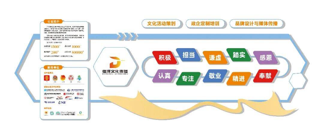 公司成立于2019年,位于广东金融高新区国金中心。作为一家专业的文化传播公司,企业致力于为党政机关、企事业单位等提供全面的文化服务项目,核心业务涵盖文化活动策划、政企定制培训、品牌设计与媒体传播三大板块。