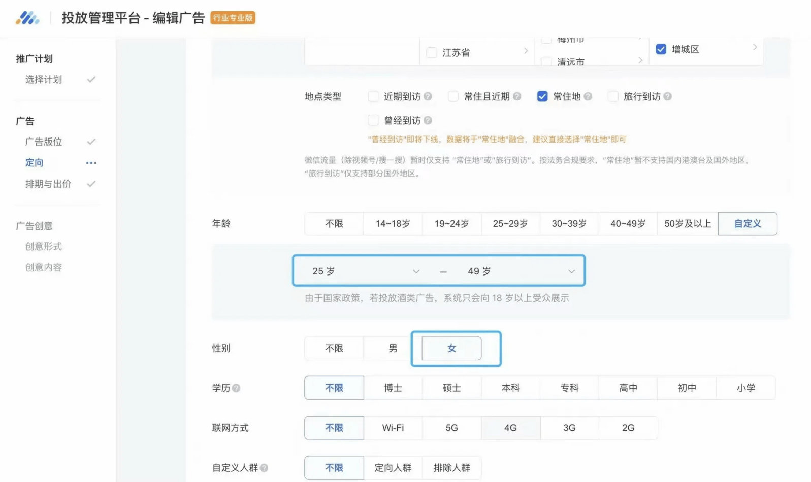 4. 搭建广告计划:按照甲方挑好的广告样式,搭建广告框架。同时设置定向条件,比如选好目标投放区域、目标年龄段、性别、学历、婚姻状况,还有用户手机联网方式和手机系统等。